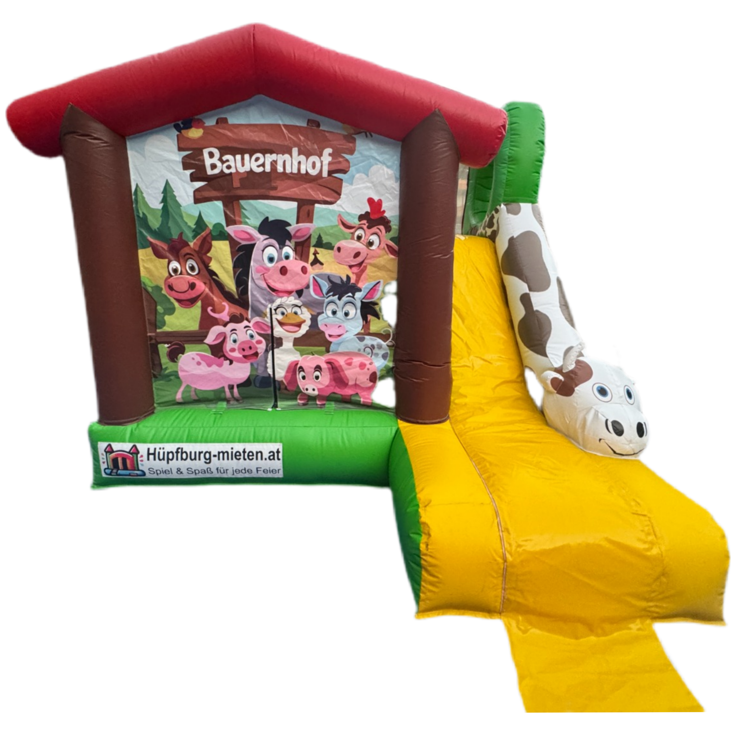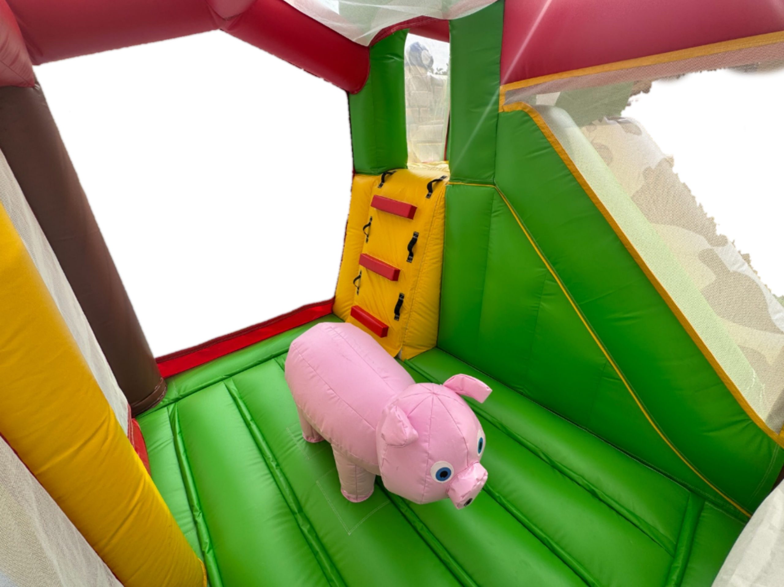 Ein Highlight ist das rosa reitbare Schwein im Inneren der Hüpfburg!
